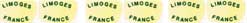 | Ecriture | prix unitaire de : | | 1 à 4 | 5 à 10 | 10 et + | | | Crayon magique | Permet d'ôter les poussières sur le décor |  | 2,6 | 2,4 | 2,2 | | | Crayon porcelaine N° 1 | Il écrit sur la porcelaine et disparait à la cuisson |  | 1,6 | 1,4 | 1,2 | | | Crayon porcelaine N° 2 | idem, mais plus gras |  | 1,6 | 1,4 | 1,2 | | | Porte-crayon | utilisez vos crayons jusqu'au bout |  | 3,1 | 2,7 | 2,2 | | | Porte-plume bois | en bois naturel pour toutes plumes |  | 2,0 | 1,8 | 1,5 | | | Porte-plumes métal | pour plume tubulaire |  | 4,6 | 4,3 | 3,8 | | | Porte-plumes Atome | en plastique avec une plume |  | 1,5 | 1,4 | 1,2 | | | Porte-plumes à levier | plastique, pour toutes plumes |  | 2,3 | 2,0 | 1,5 | | | Stylo effaceur | permet d'ôter les traces avant la cuisson |  | 9,0 | 8,0 | 7,0 | | | Crayon de hêtre | en bois dur, pour gratter la peinture sèche |  | 5,0 | 4,5 | 4,0 | | | Crayon haute température | résite à la cuisson en virant au gris sombre |  | 7,0 | 6,5 | 6,0 | | | Pointe décalque | avec 2 embouts de taille différente |  | 4,0 | 3,5 | 3,0 | | | Embossoir | pour décalquer ou faire des gouttes en relief |  | 4,0 | 3,5 | 3,0 | | | | Gratte-bosse | prix unitaire de : | | 1 à 4 | 5 à 10 | 10 et + | | | Stylo gratte bosse | fibres rétractables d'un diamètre de 4 mm |  | 4,6 | 4,0 | 3,5 | | | Gratte bosse GM | Long.= 10 cm, diamètre = 15 mm |  | 7,6 | 7,3 | 6,8 | | | Gratte bosse PM | Long.= 10 cm, diamètre = 8 mm |  | 5,4 | 5,0 | 4,5 | | | Gratte bosse sans fibre de verre | Long.= 10 cm, diamètre = 15 m |  | 26,0 | 24,0 | 20,0 | | | | Plumes | prix unitaire de : | | 1 à 4 | 5 à 10 | 10 et + | | | Plume atome | pour le dessin, boite de 12 plumes |  | 4,1 | 4,0 | 3,8 | | | Plume sergent Major | pour l'écriture, boite de 12 plumes |  | 4,1 | 4,0 | 3,8 | | | Plume dure | semi dure pour le dessin, boite de 5 plumes |  | 4,1 | 4,0 | 3,8 | | | Plume sténo | souple pour l'anglaise, boite de 5 plumes |  | 4,1 | 4,0 | 3,8 | | | Plume tubulaire | Speedball Huntplume américaine extra dure. Prix unitaire |  | 2,0 | 1,9 | 1,8 | | | | Divers | prix unitaire de : | | 1 à 4 | 5 à 10 | 10 et + | | | Gomme lustres | pour effacer les traces de lustres | | 4,0 | 3,5 | 3,0 | | | Gomme métaux douce | pour effacer les traces de métaux précieux | | 4,0 | 3,5 | 3,0 | | | Gomme métaux dure | idem, mais plus agressif | | 4,0 | 3,5 | 3,0 | | | Papier carbone noir courant | pochette de 10 feuilles A4 | | 5,0 | 4,0 | 3,0 | | | Papier carbone rouge à la cire | papier à la cire, trait très fin, prix à la feuille | | 3,0 | 2,8 | 2,5 | | | Papier carbone Usa haute qualité | carbine de très haute qualité, trait très fin, prix à la feuille | | 2,0 | 1,8 | 1,5 | | | Papier soft | grain de 5 µ. 114 x 138 mm Ponçage doux du décor après cuisson. | | 2,5 | 2,0 | 1,5 | | | Cercle diviseur | disposez exactement vos motifs autour d'une assiette | | 2,0 | 1,8 | 1,5 | | | Planche de 18 chromos Limoges | |  | 3,0 | 2,8 | 2,5 |